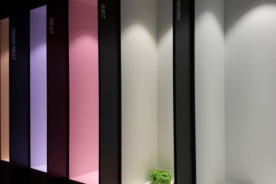 Les luminaires mis en situation afin de mettre en valeur leurs différentes caractéristiques techniques. On voit clairement l’influence de l’IRC sur le rendu des couleurs, les phénomènes d’angles de diffusion, les enjeux des LED de couleur chaude ou de couleur froide, etc.. . afin de réaliser un choix affiné sur l’appareil le plus en adéquation à la situation.